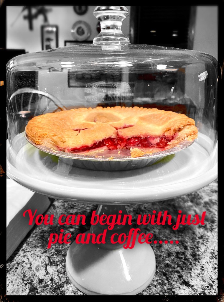 What followed was an inspiration fueled by the color red! Swimsuit shopping? Red. Additions to the flower garden? Red drift rose bushes. And, an idea which lit me afire… I did not need to be perfect in order to start a project or pursue a dream. “You can begin with just pie and coffee.”