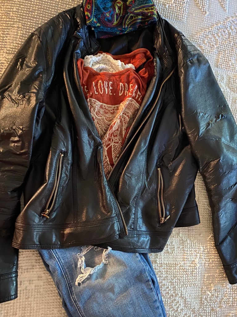 My ‘day after’ outfit is a balance to the refinery of today’s, with torn jeans, faux leather jacket, my live-love-dream tank top in clay red-brown and… my cardigan from today, if need be.