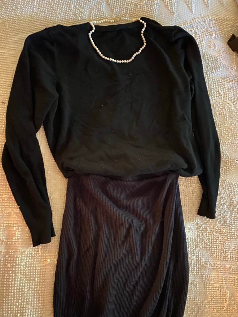 I eliminated a sparkly chiffon belted dress and a simple knit shirt, deciding upon a light knit, pencil skirt topped with a lightweight black cardigan. One of my favorite wardrobe staples is a cardigan worn backwards. My mother had told me that was the style in the 1950’s. (I envision a Hepburn-ish silhouette when I do so).