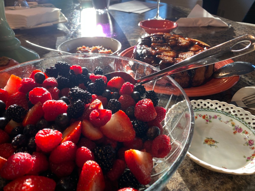 I’m rather into menus, so I included a mix of fresh berries, orange juice, toast and monkey bread. Oh! And tiny Christmas cookies! I like the combination of cooking, talking and meeting while doing all the above.