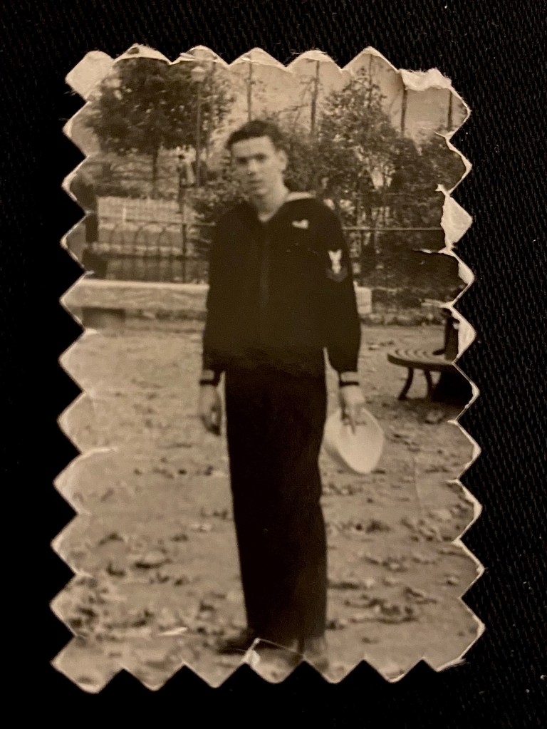 As she said those words she dug in that extra checkbook flap of leather. Her fingers produced two photos. Both were black and white, approximately an inch by an inch and one-half, with serrated edges. Both were Navy photos from the early 1950’s. One showed him in Cuba; the other, onboard the ship. She thought it wonderful I could preserve them with some quality by photographing them.