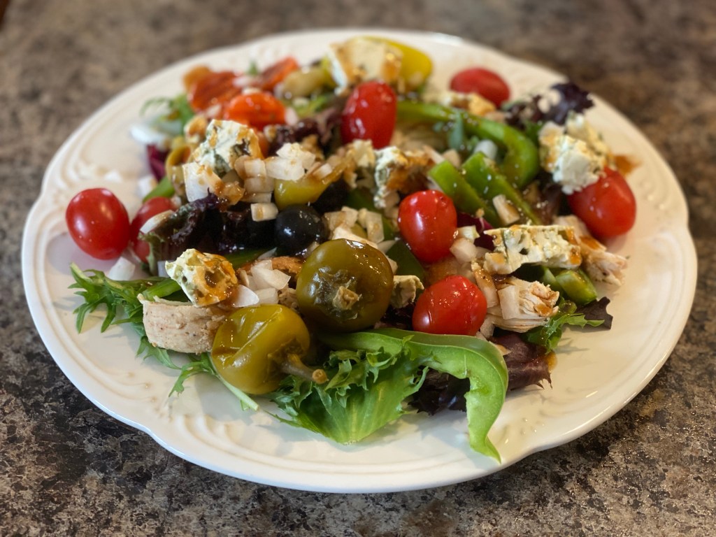 I suppose the answer ‘salad’ is not an eye-raising surprise. But even that can get boring which surprises me. Here I had a smorgasbord of olives, garnishes -giardiniera, cheeses and fresh vegetables, none of which were my usual refrigerator stocked items.