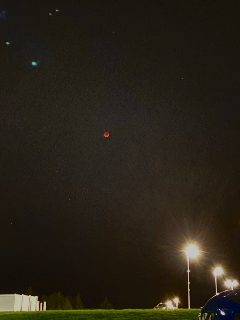 I knew the Full Flower Moon with its solar eclipse was due to appear. On that particular night, admittedly I had forgotten. As I walked across the parking lot, with its own busy-busy sounds and bright lights, my eyes caught the shocking sight of red in the sky.