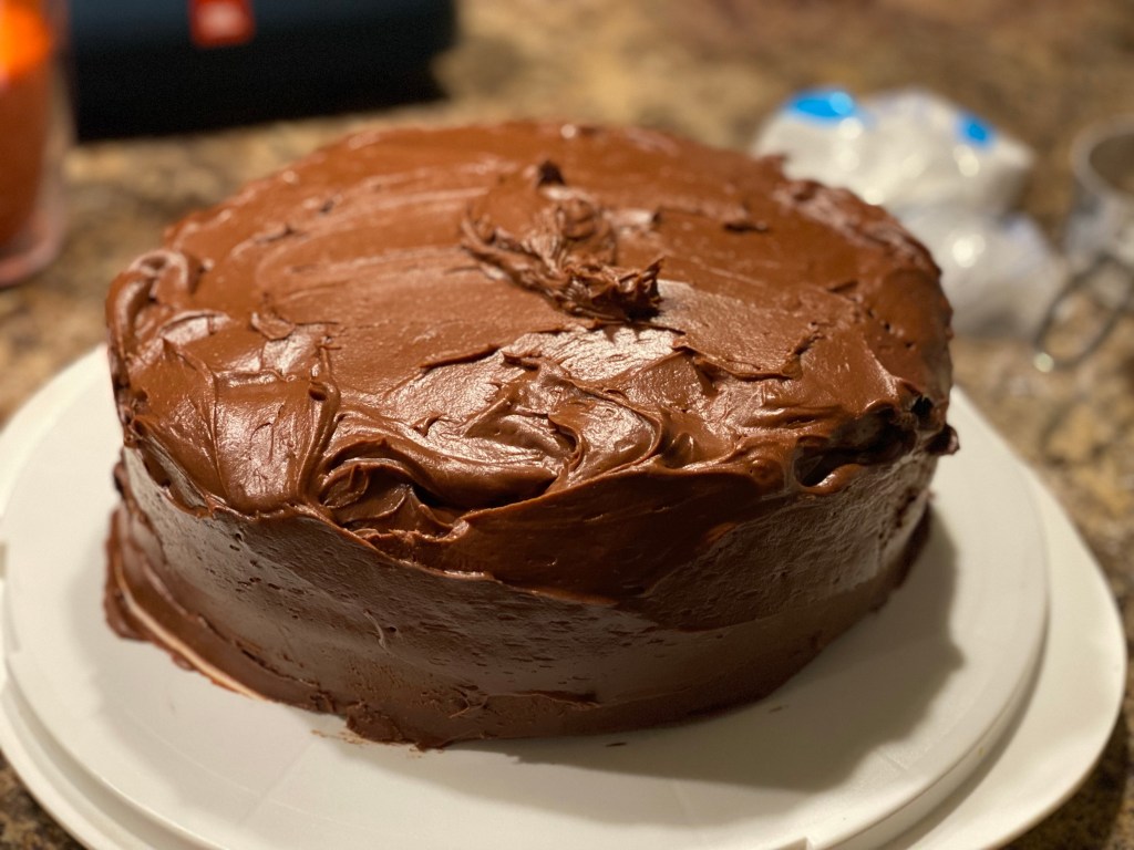 I had not baked anything other than chocolate chip cookies in a very long time. So when I needed to bake for a gathering, I revisited my chocolate cake recipe that I had put together from various cookbooks. I added a simple fudge frosting I had not made in years.