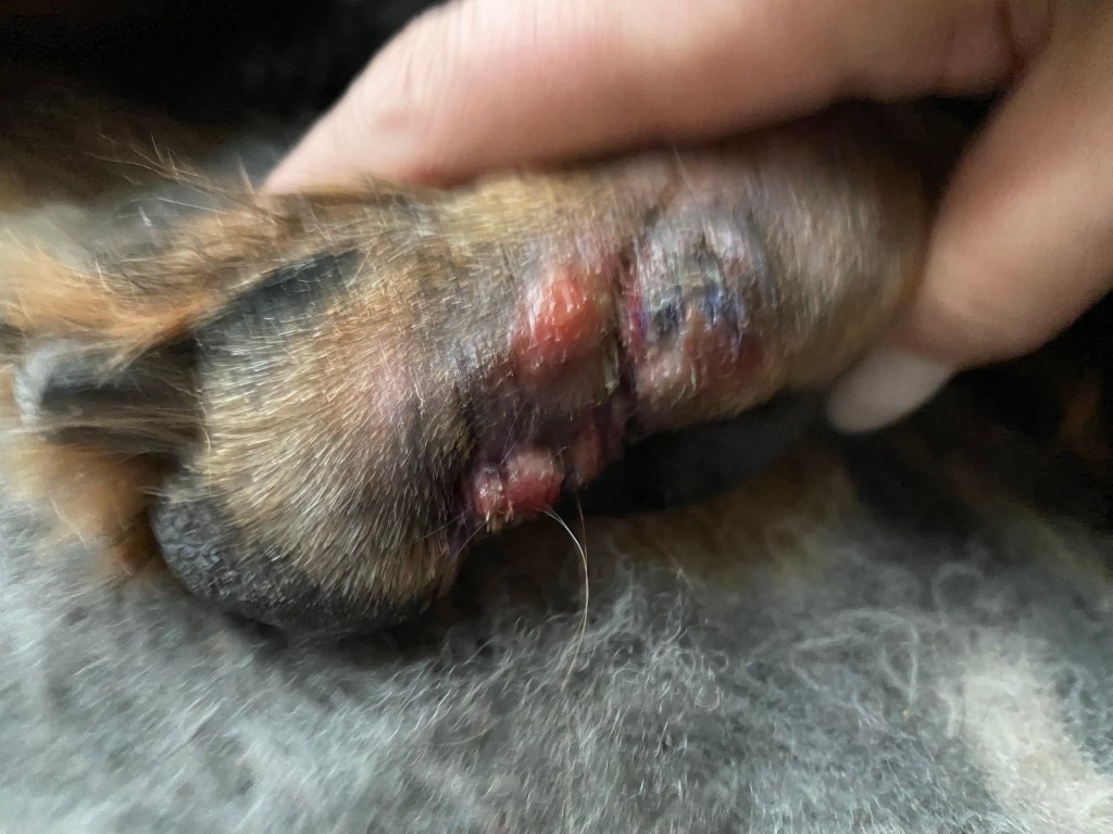 Two weeks after surgery I had wrapped his paw too tightly. His paw swelled. The area under the tape had become infected.